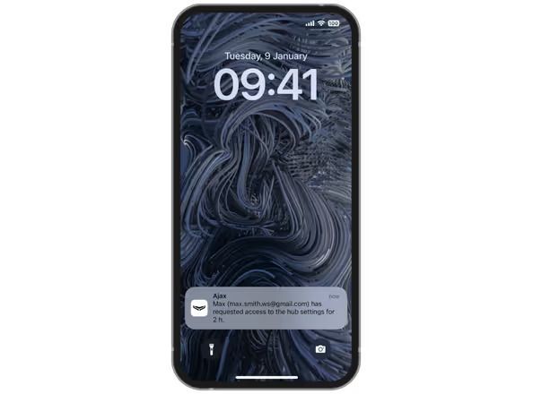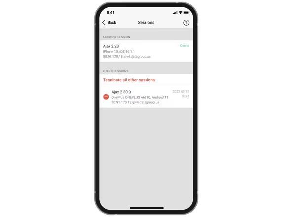 The Ajax app is built with multiple layers of security to protect your account. In addition to standard password protection, you can enable two-factor authentication, monitor or terminate sessions on other devices, and provide temporary system access to certified specialists if needed.
